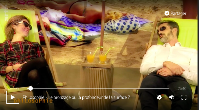A voir(revoir) sur Arte replay jusqu’au 17 avril 2019 : Philosophie – Le bronzage ou la profondeur de la surface. Avec les philosophes Rafaël Entoven et Julia de Funès, et l’historien Pascal Ory.