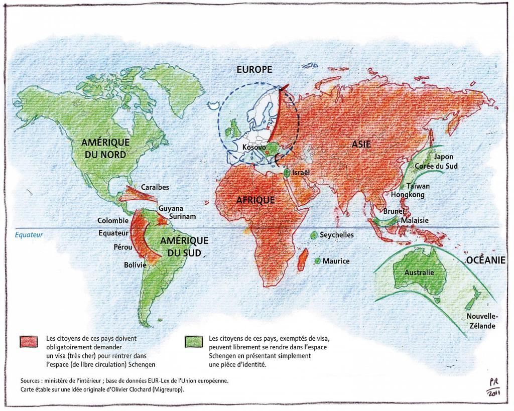 A compléter, toujours sur l’excellent visioncarto.net, avec deux autres cartes sur le même thème : « Pour Schengen, un monde bienvenu et un monde « d’indésirables« , une carte de Philippe Rekacewicz de janvier 2016, qui montre de façon frappante l’inégalité dans l’accès à l’espace Schengen depuis le monde entier.