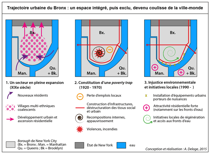 - Ce qui est vrai des groupes sociaux l’est aussi des espaces : si Manhattan concentre toute la lumière, son développement ne peut être pensé indépendamment des quatre autres boroughs [3] constitutifs de la ville de New York : Brooklyn, Queens, Bronx et Staten Island. Comme de nombreux cœurs d’agglomération états-uniens, New York City a été affectée par des difficultés urbaines dans les années 1960-70, avant de se relever depuis les années 1990 (Greenberg, 2008). Elle affiche aujourd’hui un essor économique, culturel et urbain réaffirmé une fois passé le traumatisme du 11-Septembre, comme en atteste la vitalité de son marché immobilier, véritable moteur de croissance. On peut alors se demander dans quelle mesure ce dynamisme retrouvé alimente ou bien diminue l’écart entre les espaces les plus pauvres et les espaces les plus riches de la ville. Si New York exemplifie la ville néolibérale (Hackworth, 2006), où les forces du marché jouent à plein, elle se caractérise aussi par la densité exceptionnelle et le dynamisme de ses organisations communautaires, porteuses d’initiatives endogènes en termes d’aménagement urbain (Angotti, 2008).